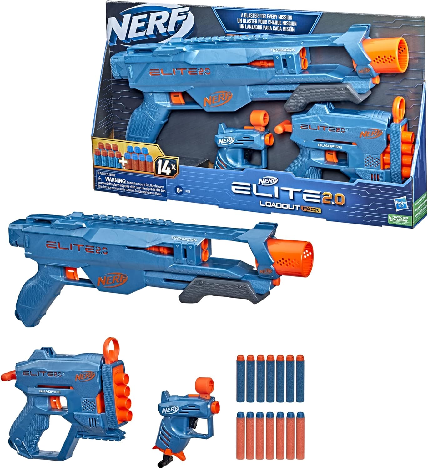 Great for gift-giving! No batteries required NERF ELITE 2.0 TECHNICIAN DS-2 BLASTER WITH 2-DART BLASTING: Fire 2 darts in a row! Includes pump action priming, tactical rail, and stock attachment point (stock not included) NERF ELITE 2.0 QUADFIRE QS-4 BLASTER WITH 4-DART BLASTING: Unleash 4 darts in a row! Includes pull-back priming handle and targeting sight NERF ELITE 2.0 ACE SD-1 BLASTER WITH TARGETING SIGHT: Launches 1 dart and has a targeting sight that doubles as onboard 1-dart storage 14 NERF ELITE DARTS: This set of 3 Nerf Elite 2.0 blasters includes 14 Official Nerf Elite foam darts, giving you enough to fully load all 3 blasters and backup darts for reloads.