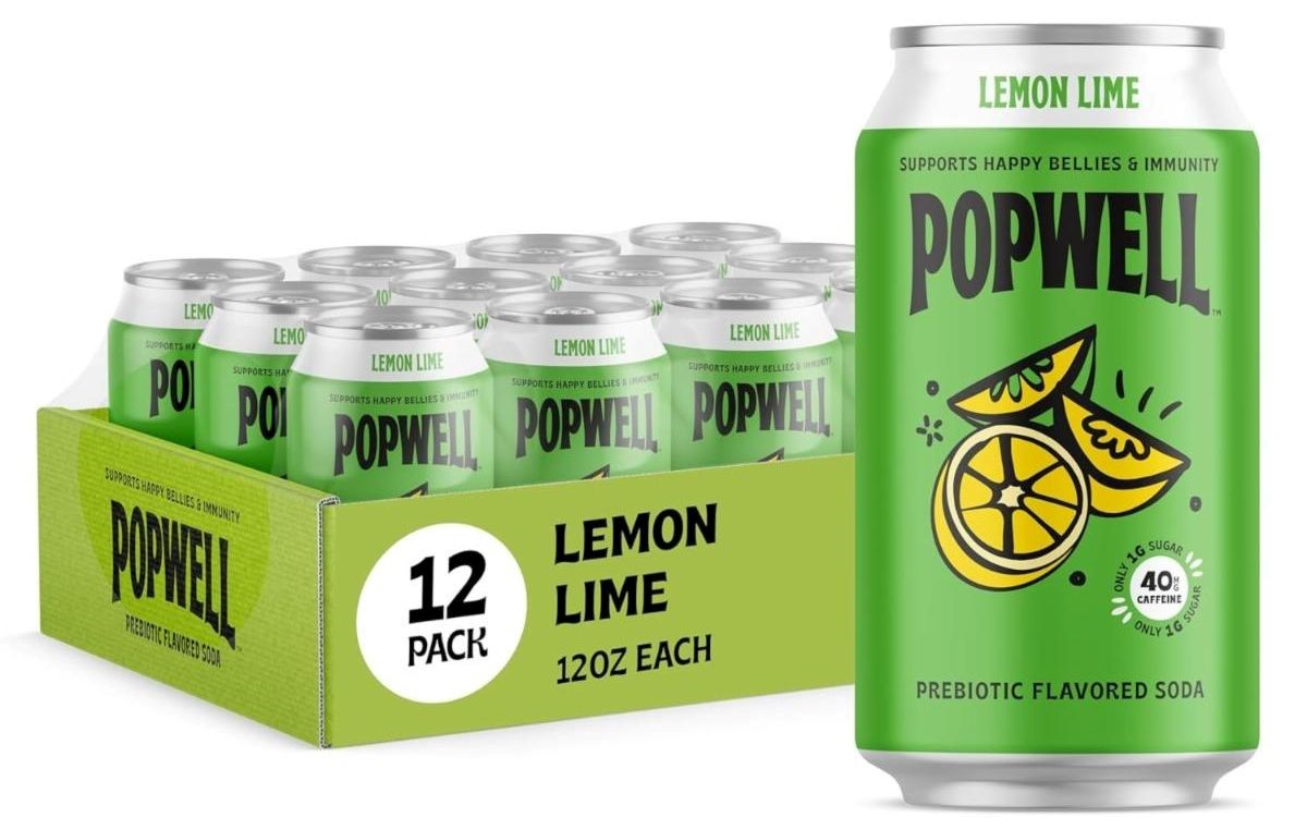 Popwell 12 Pack 12 fl oz Lemon Lime Caffeinated Prebiotic Soda